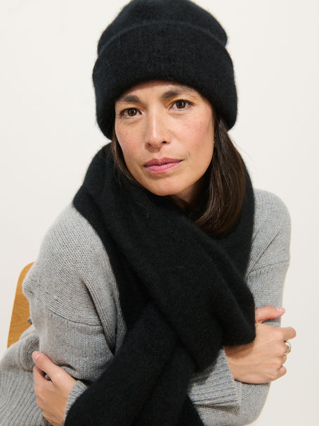 The Scarf In Brushed Cashmere, in black, is displayed on a plain white background with one end looped to form a loose knot.