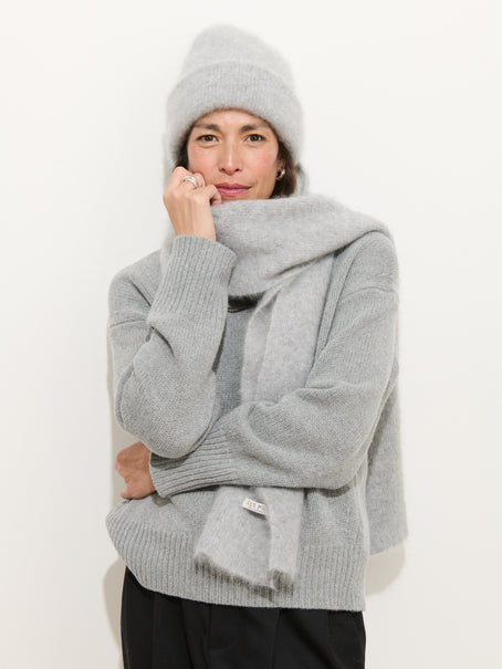 The Scarf In Brushed Cashmere, in light gray with a soft texture, is laid flat on a white background with both ends spread out and the middle gently twisted.