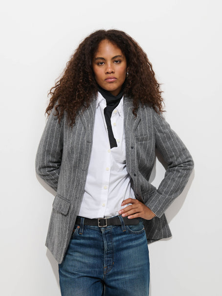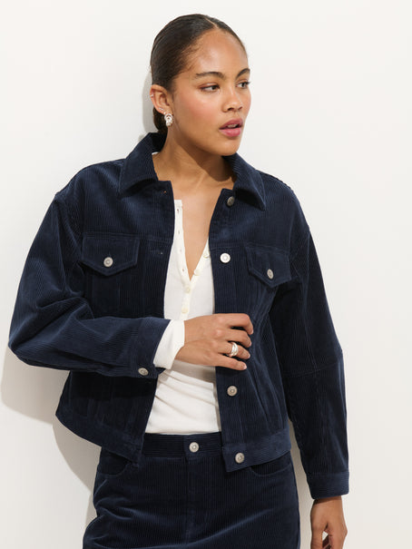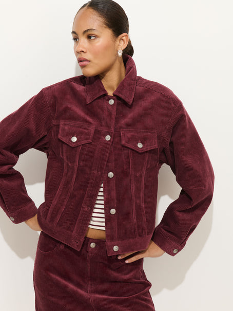 The Camden Rider Jacket in Corduroy is a dark brown cotton jacket with a collar, long sleeves, front button closure, and two chest pockets—perfect for women’s layering—shown laid flat on a white background.
