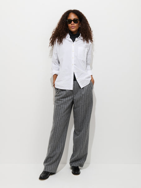 Camden Pant In Corduroy: Women's high-waisted, straight-leg relaxed fit corduroy pants in dark burgundy with front and back pockets, button closure, visible texture, and made from 100% cotton.