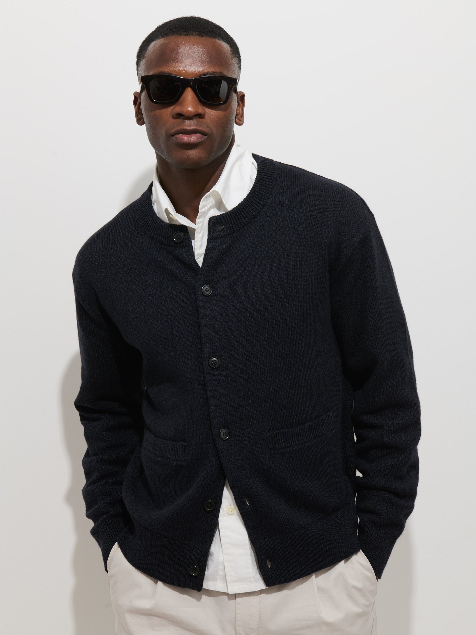 - Easy crew neck, fully fashioned, hand-linked, and hand-finished with corozo buttons and front pockets.