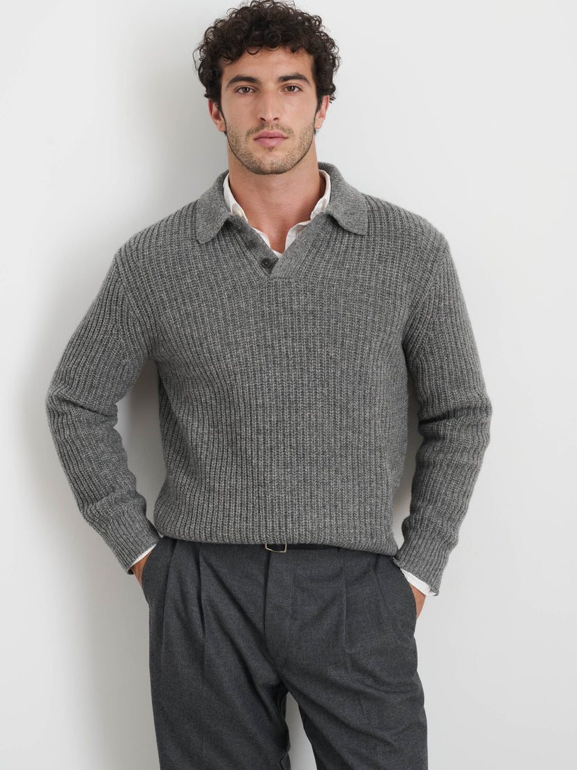 A sweater polo made with superfine chunky ribbed Merino wool.