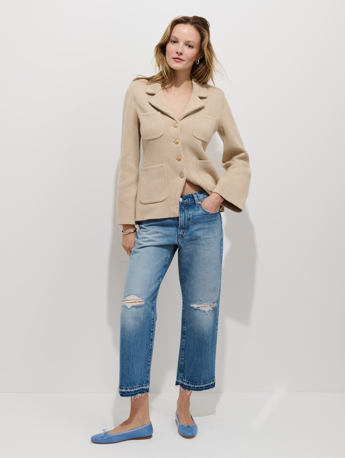 - Mid-rise, relaxed boyish fit, cropped inseam, raw hem, torn knees, whiskering, zipper fly, signature X at the back. Made in LA.